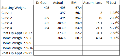 Since I won’t be going to the Dr as much I am going to be doing weekly weigh ins at home. I dug through my junk drawer and found the 3 AAA batteries that I needed to crank up my very dead scale! My weight was 364.6! Holy Cow! I am down 40.4 lbs