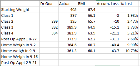 It’s only been a month so how much could possibly change? A LOT! It’s amazing how much has changed. Getting in and out of the car is easier. I can bend over and shave my legs. When I get out of bed in the morning I can immediately walk without pain (before I had to stand there and wait before I could move). It’s easier to get off the couch. I have already been able to fit into a seat out in public that I normally wouldn’t have been able to. I want to get up and clean house. My normal walking is faster. I don’t feel restricted wearing my seat belt in the car. I can easily wear tennis shoes since my feet are not swollen. I am down one size in most of my clothes. I have more confidence. I have less anxiety because I can do all these things.