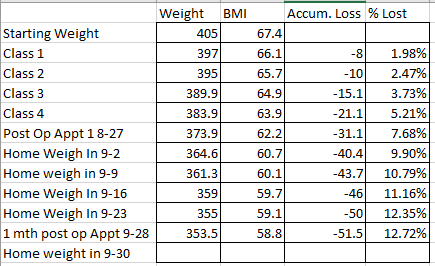 I left that appointment very motivated. I knew I was doing good that whole month, but not knowing if it was good in the eyes of the Dr kept me a little on edge and worried. Now that I know I conquered the first month and my surgeons are happy with my progress, that feeling of worry has left me. I got off to a great start. As I sat in my diet class and listened to the other people complain about their lack of weight loss or the crappy way they felt, I got annoyed because in the same breath they all pretty much said they were doing quite a bit of cheating. Eating things they shouldn’t and not following the program. I am not saint, I cheated 2 or 3 times in small amounts, but I learned my lesson quickly and have been doing great for a couple weeks. I worked very hard prior to surgery to get myself into a mental state that I could handle this. I put a huge focus on my emotional eating because I knew if I didn’t then I would NOT be successful. I think these programs need to put a much bigger focus on making sure that people are getting that under control before they have surgery. Any bariatric surgery can be cheated and eaten around.